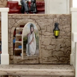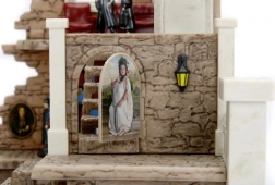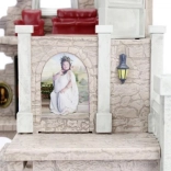 Kamenolika minijatura dvorca sa stupovima i malom vanjskom lampom, pogodna za izlaganje ili igru.