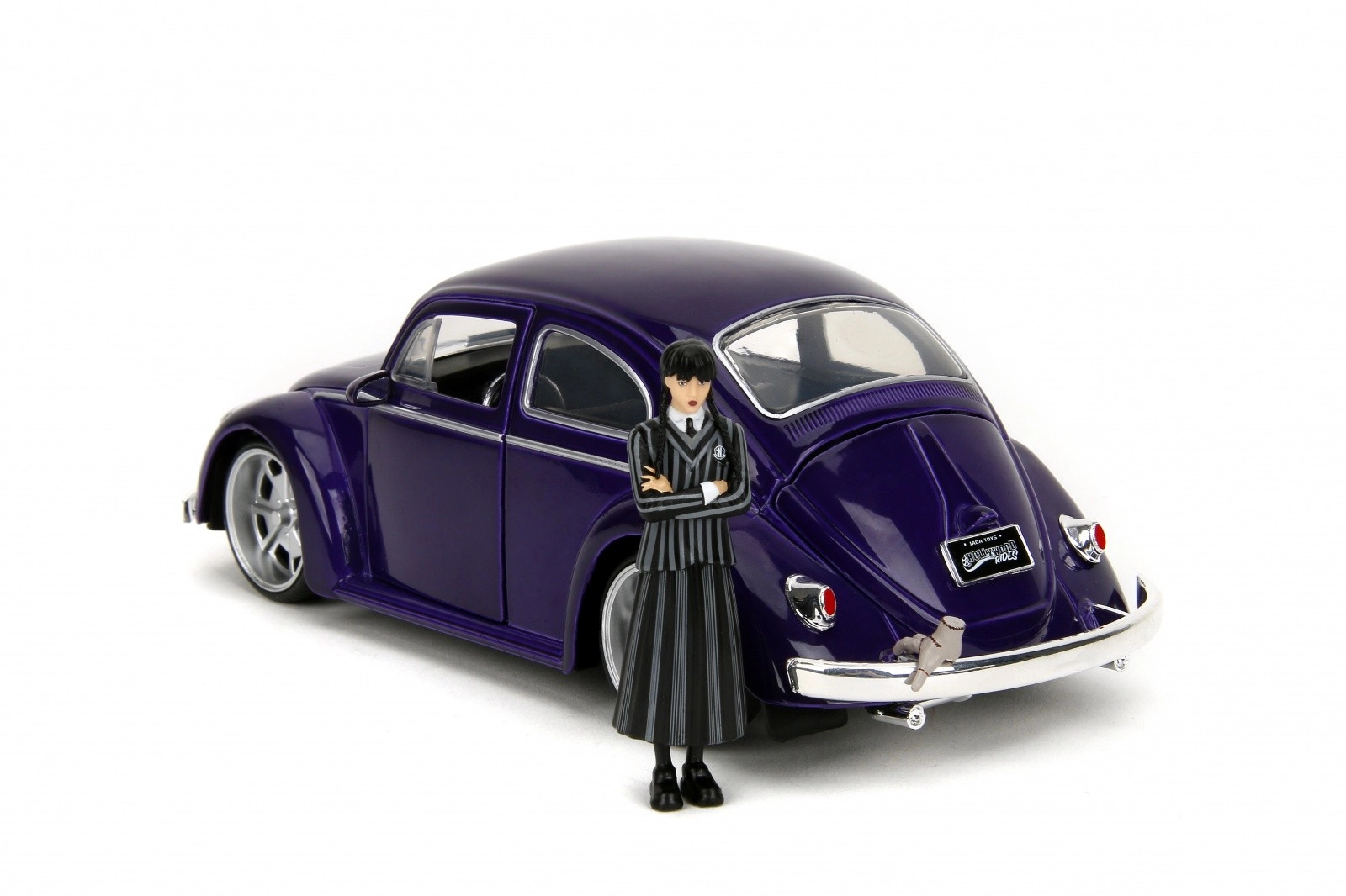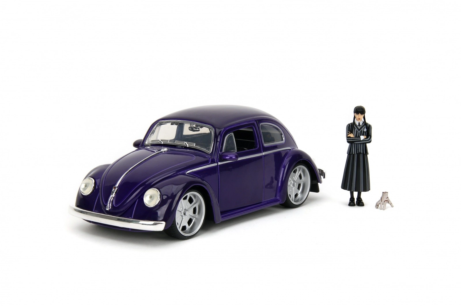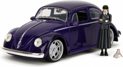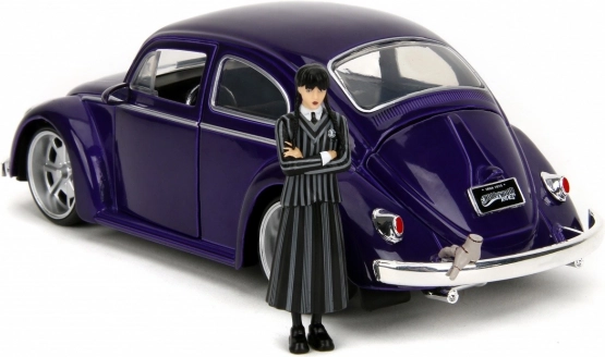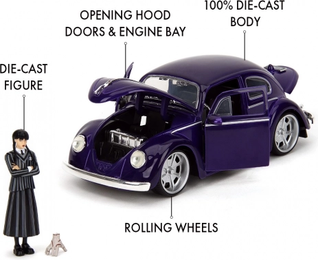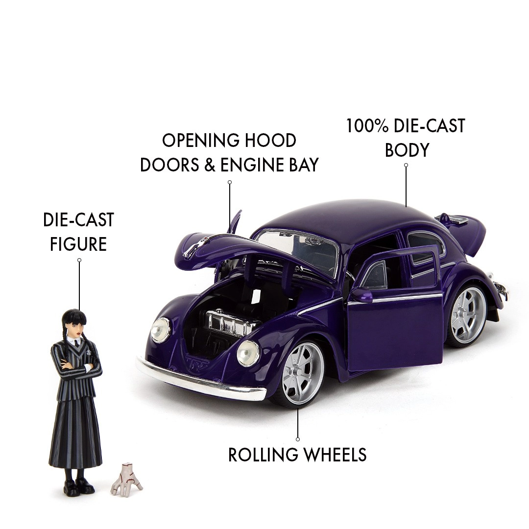 Službeno licencirani kolekcionarski set tvrtke Jada Toys donosi ikonični Volkswagen Beetle (1972) u mjerilu 1:24 i figuricu Wednesday Addams uključujući Ručicu (Thing). Metalna izrada s otvarajućim vratima, poklopcem prtljažnika i poklopcem motora, gumeni kotači i precizni detalji jamče sjajno iskustvo izlaganja i igranja. Idealno za obožavatelje serije Wednesday i kolekcionare od 8 godina naviše.