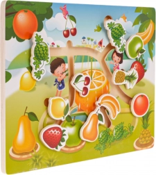 Ova drvena slagalica osmišljena je za najmlađu djecu koja žele otkrivati svijet igračaka kroz igru. Sadrži šarene dijelove koji prikazuju razno voće, a umeću se u drvenu ploču.