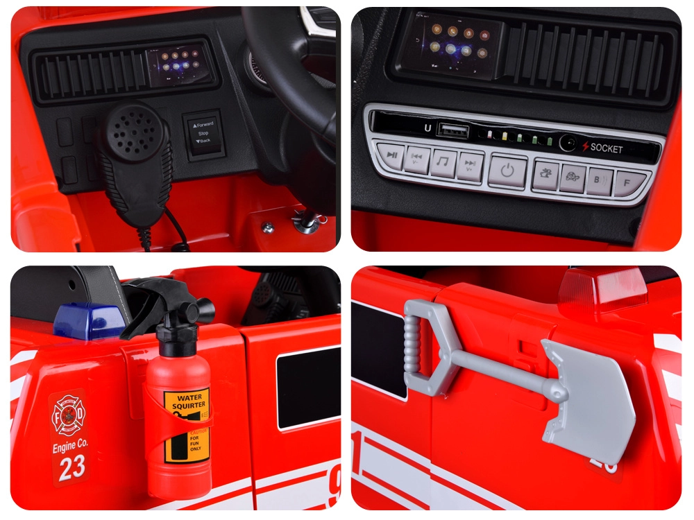 S ovim fantastičnim električnim vatrogasnim automobilom vaš će se mali heroj osjećati kao pravi vatrogasac. Ovo vozilo na akumulator opremljeno je funkcionalnim svjetlima i zvukovima koji pružaju realističan doživljaj i uzbuđenje tijekom igre. Klasičan crveni dizajn s bijelim detaljima oduševit će svako dijete.