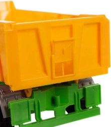Prikolica s hidrauličkim kihanjem lako iskrcava teret. Otvoriva stražnja bočnica i klizna ladica omogućuju doziranje sadržaja u manjim količinama, dok prednja potporna noga stabilizira prikolicu pri kipanju. Glatke površine od ABS plastike brzo se čiste vlažnom krpom, pa igra može svakodnevno nastaviti.