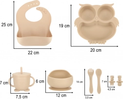 Tanjur u obliku sove s tri pregrade pomaže privlačno odvojiti hranu. Meki silikon za prehranu je nježan prema dječjim desnima, siguran i jednostavan za čišćenje. Ergonomski pribor (standardni i mini) pristaje dječjoj ručici i potiče razvoj fine motorike.