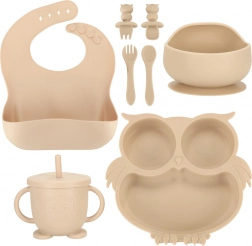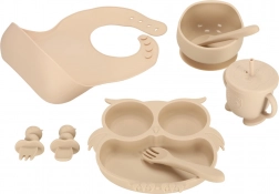 Ovaj bež silikonski set za jelo djeci olakšava učenje samostalnog hranjenja, a roditeljima osigurava mirnije obroke. Prijanjalice na tanjuru i zdjelici sprječavaju prevrtanje, šalica sa slamkom potiče samostalno pijenje, a podbradak s dubokim džepom hvata ispale komadiće.