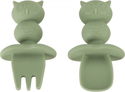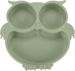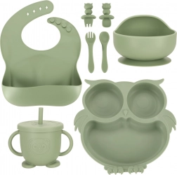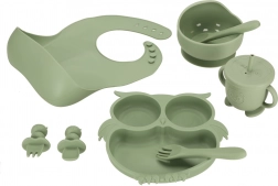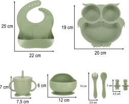 Praktičan i atraktivan silikonski set posuđa namijenjen djeci. Sadrži sve što je vašem djetetu potrebno za udobno i zabavno blagovanje. Motiv sove u vojnički zelenoj boji nije samo moderan, već će razveseliti svakog malog izbirljivca.