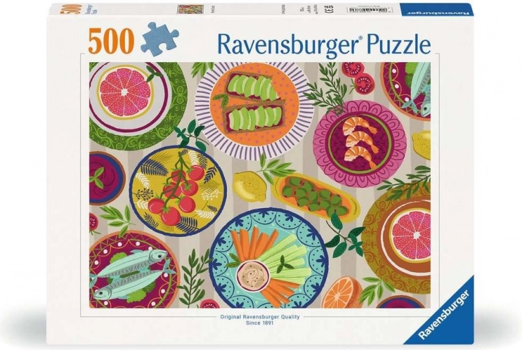 Puzzle RAVENSBURGER Mediteranska kuhinja, 500 dijelova. Kvalitetan izrez, intenzivne boje, dimenzije nakon slaganja cca 49 × 36 cm. Idealno za opuštanje i kao poklon.