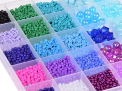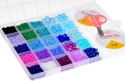Set je pakiran u praktično, prozirno pakiranje nalik kovčegu, podijeljeno u pretince koji sprječavaju miješanje perli. U setu su također 2 špulice prozirne niti i škare, što omogućuje odmah započeti izradu željenog nakita.