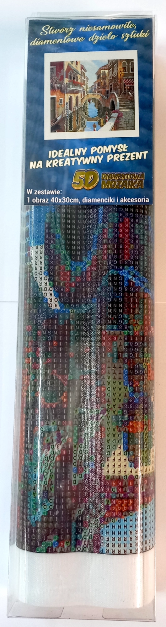 Pakiranje sadrži: platno s pretisnutom slikom, pero za aplikaciju kamenčića, posudicu za sipanje kamenčića, vosak za lijepljenje, set raznobojnih kamenčića.