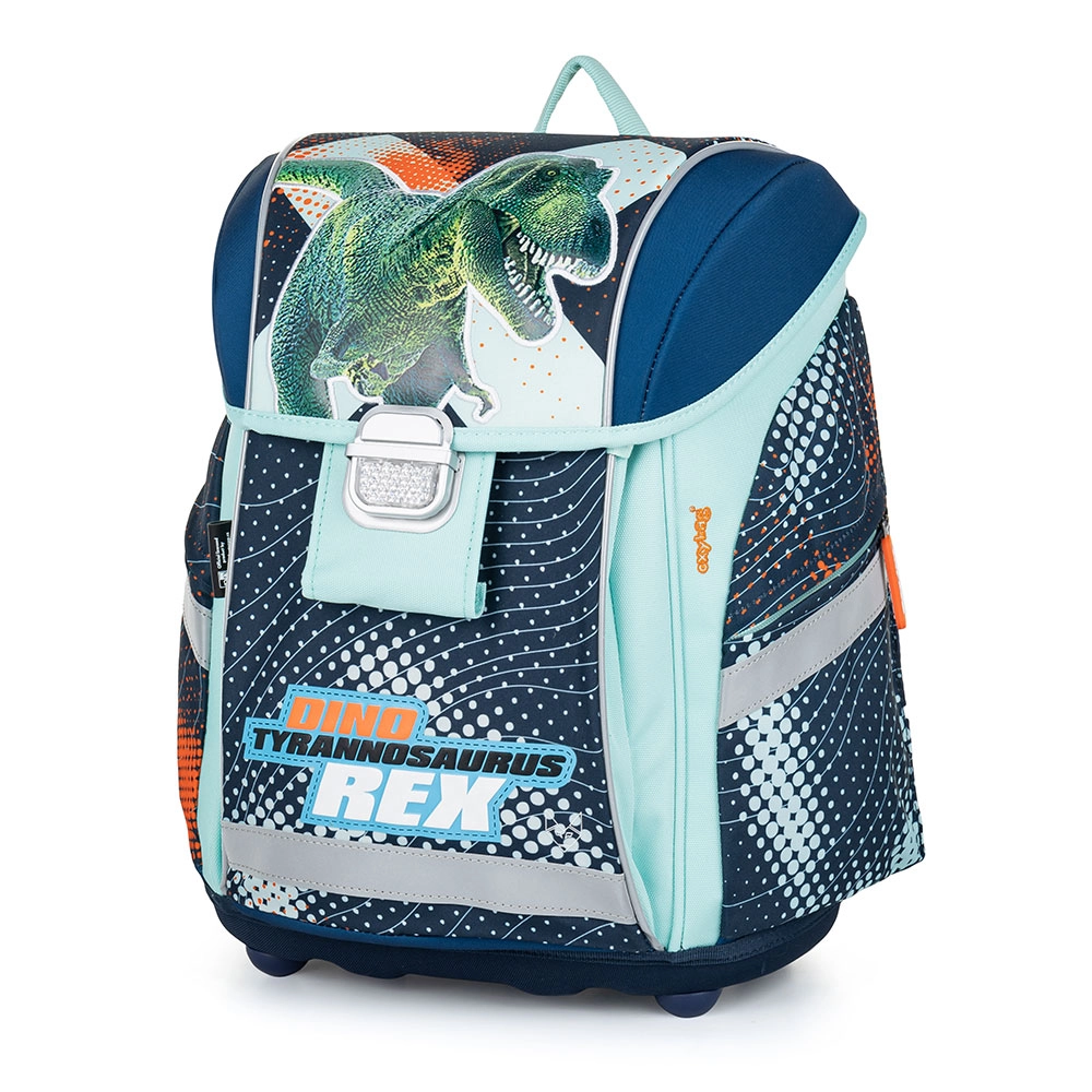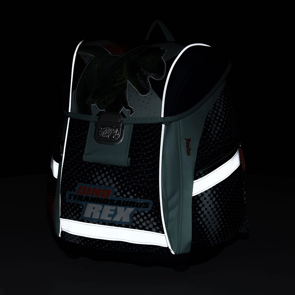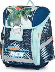 Lagan i ergonomski školski set za male školarce s omiljenim motivom T-Rexa. Sastavni dio je olakšani ruksak od 900 g s prozračnim podstavljenjem i prsnom trakom, zatim praktična vrećica za tjelesni i jednokatna pernica bez punjenja. Set nudi puno džepova, unutarnji razdjelnik i reflektirajuće elemente za sigurnost na putu u školu.