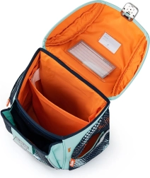 Unutar ruksaka nalazi se pregledan unutarnji razdjelnik i dovoljno džepova za udžbenike, bilježnice i užinu. Prostrani volumen od 27 l i nosivost 8 kg bez problema podnose svakodnevnu školsku opremu. Dio seta je i vrećica za tjelesni sa zatezanjem na uzice te jednokatna pernica s dvjema klapnama i gumenim petljama za preglednu organizaciju pribora za pisanje.