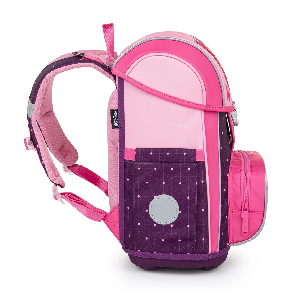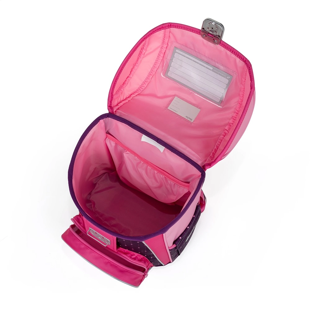 Praktična organizacija s jednim prostranim pretincem olakšava pregledno spremanje udžbenika i bilježnica za 1.–2. razred. Prednji džep namijenjen je užini ili sitnicama, a sigurnosna kopča omogućuje lako i pouzdano zatvaranje. Brojni reflektirajući elementi povećavaju vidljivost djeteta u sumrak i pri smanjenoj vidljivosti.