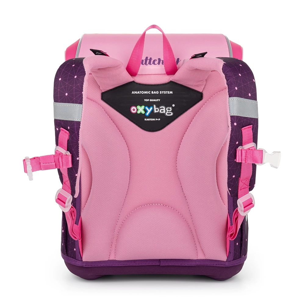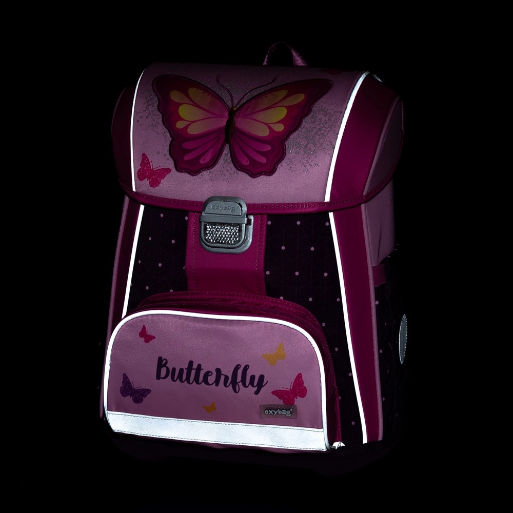 Stilova školska aktovka s motivom leptira spaja atraktivan dizajn i naglasak na zdravo nošenje. Anatomski oblikovana leđa s prozračnom podstavom i široke podstavljene naramenice pružaju udobnost i pri svakodnevnom nošenju. Čvrsto dno i unutarnje ojačanje održavaju oblik torbe i štite sadržaj od prevrćanja i prosipanja.