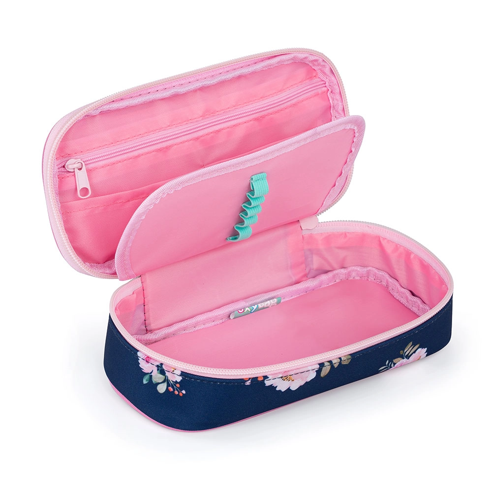 Ova etue dizajnirana je za preglednu organizaciju školskog pribora. Izdržljiva izrada s čvrstim patentnim zatvaračima štiti sadržaj, dok preklop s elastičnim držačima s obje strane sigurno drži olovke, kemijske ili flomastere. Tu je i džepiću s patentnim zatvaračem za sitnice, a ispod preklopa prostor za slobodno odlaganje potrepština koje želite imati pri ruci.