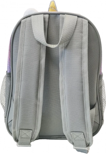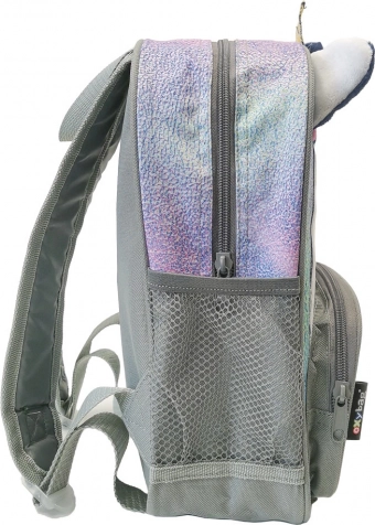 Ruksak ima jedan veliki glavni pretinac za odjeću ili igračku, manji prednji džep za užinu i bočne džepiće za bocu s pićem. Kompaktne dimenzije i mala težina idealne su za djeđa.