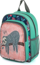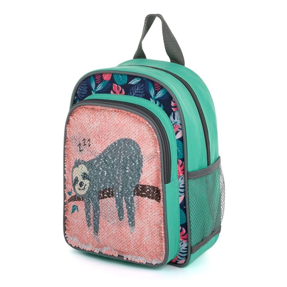 Slatki dječji ruksak za predškolce s motivom lenjivca i sjajnim prednjim džepom s perlicama. Nudi jedan veliki pretinac, prednji džep za užinu i bočne mrežaste džepove za bocu. Lagan dizajn i udobne podstavljene naramenice čine ruksak idealnim izborom za djecu od 3 do 6 godina.