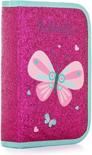 Jednokatna školska pernica s efektom šljokica i motivom leptira spaja atraktivan izgled s praktičnim rasporedom. Zahvaljujući dvama preklopima sve lako pronalazite, a pribor za pisanje ostaje sigurno pričvršćen u petljama. Prozirne folije na unutarnjim preklopima omogućuju da raspored sati imate uvijek na vidiku.