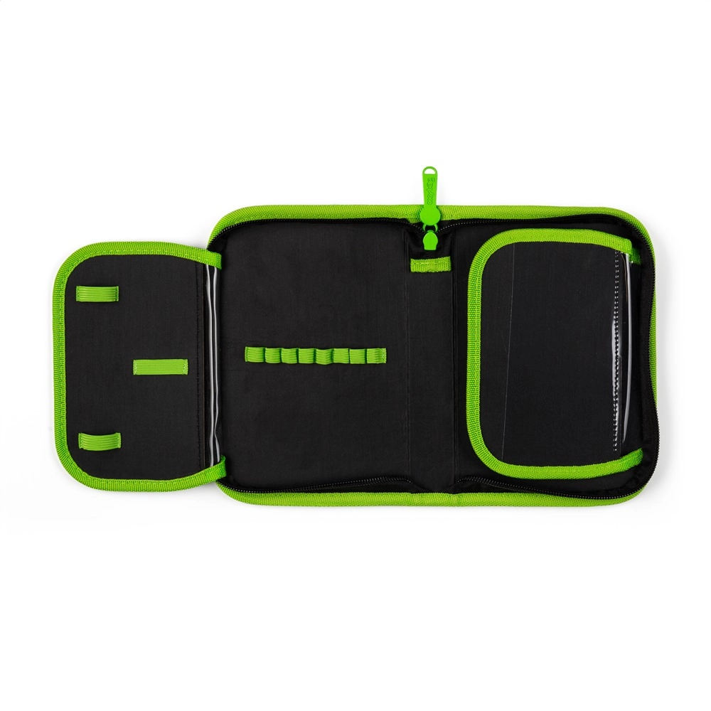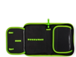Jednokatna školska pernica s 2 preklopa, prazna, sadrži 25 elastičnih držača za odlaganje pribora za pisanje. Na unutarnjim preklopima nalaze se prozirne folije za raspored sati.