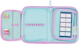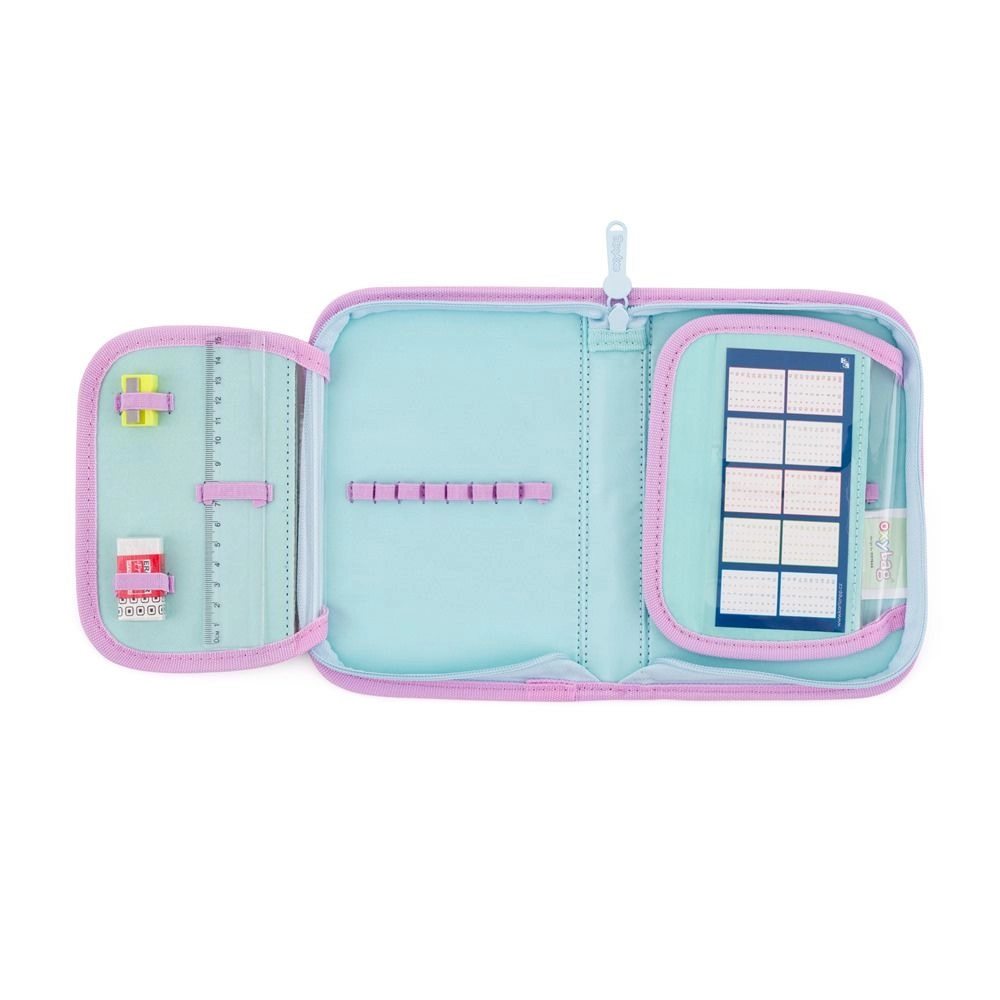 Jednokata pernica s 2 preklopa, prazna, sadrži 25 gumenih petlji za držanje pribora za pisanje. Na unutarnjim preklopima nalaze se prozirne folije za raspored sati.