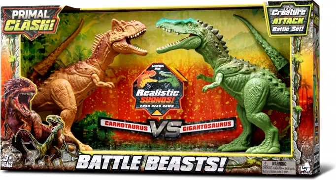 Krenite u pretpovijesnu avanturu s Primal Clash! Dino bitka setom Carnotaurus vs Gigantosaurus. Ovaj set sadrži dvije interaktivne figurice dinosaura s pokretnom glavom i čeljustima i realističnim zvučnim efektima.