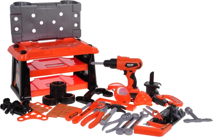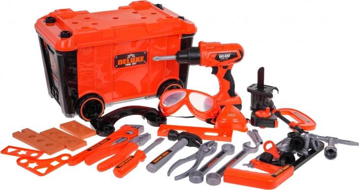 - kovčeg-radionica, .odvijač, .- nastavak za odvijanje, .- 3 x izmjenjivi bit, .- bušilica s električnom pilom, - čekić, - ravni odvijač, .- viljuškasti i okasti ključ, .- ključ, - ključ, - zaštitne naočale, .- zaštitna maska, .- mjerna posudica, - pila za drvo, .- kliješta, - ručna pila, .- stega, - metar, - 4 kotačića za kovčeg, .- 3 vijčana elementa, .- vijci, - svornjaci, .- matice. |