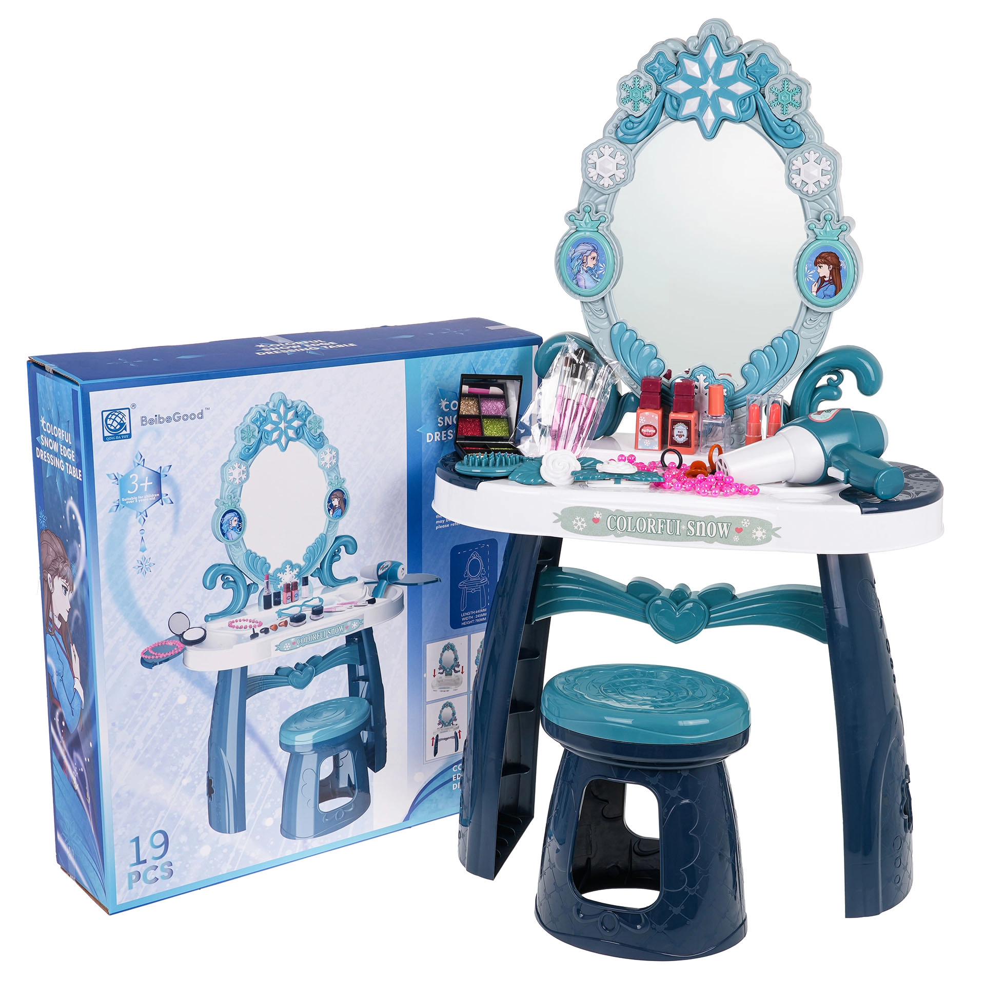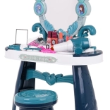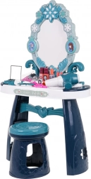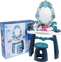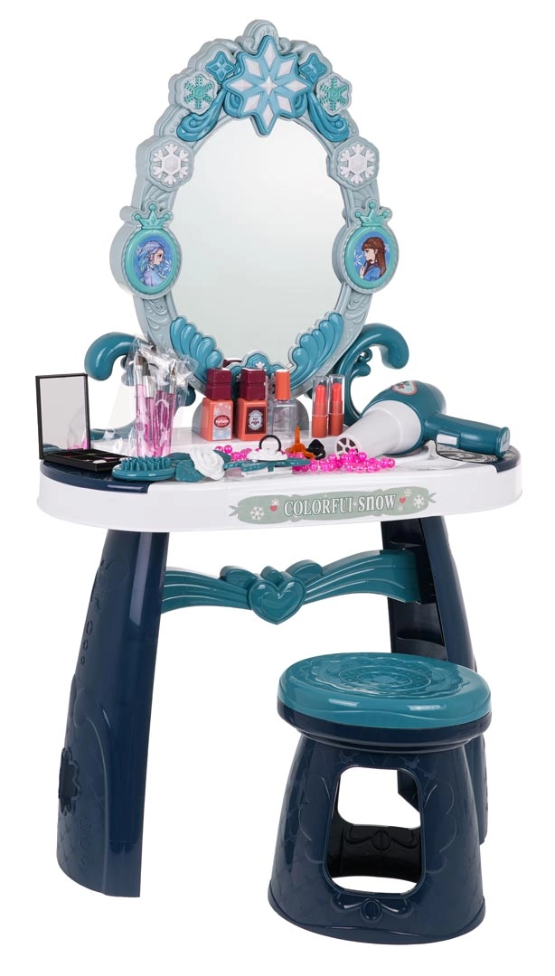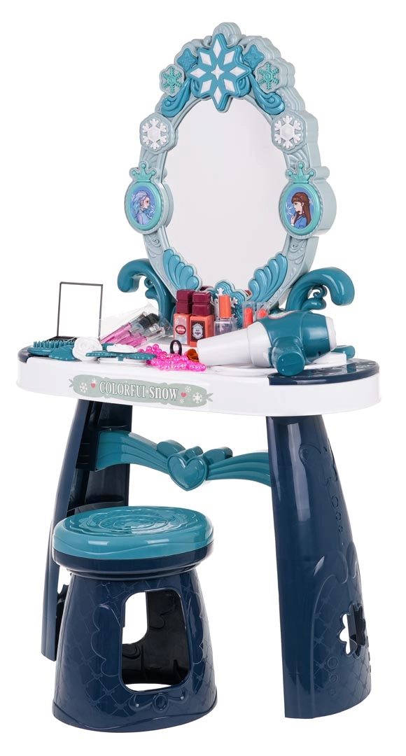 Interaktivni toaletni stolić s priborom i stoličicom, za djecu od 3 godine. Set je izrađen od najkvalitetnije plastike u živim bojama. Osim prekrasnog toaletnog stolića s pločom i ukrašenim ogledalom, za male princeze tu je i udobna stoličica. U setu se nalazi sušilo za kosu i bogat komplet dodataka za uljepšavanje. Toaletni stolić napaja se s 3 x AA 1,5 V baterije (nisu uključene), a sušilo s 1 x AA 1,5 V baterijom (nije uključena). . . Značajke seta: