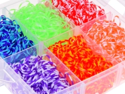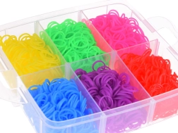 - cca 4500 kom gumica, prozirne spojne kukice, šarene/pastelne perlice, 6× male kukice, 1× velika kukica, 2× praćka, 2× razboj, 6× silikonski privjesak, prozirni organizator s pregradama