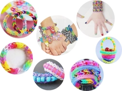 Kukice, praćke i dva razboja omogućuju izradu od jednostavnih do složenih narukvica i dodataka.