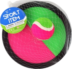 .Obruč palete izrađen je od izdržljive plastike i na stražnjoj strani ima podesivu dršku koja omogućuje prilagodbu veličine ruke. Površina palete ima gustu, čvrstu ispunu u obliku čička. Lopta je izrađena od mekog, lako pričvrstivog materijala, koji olakšava lagano hvatanje.
