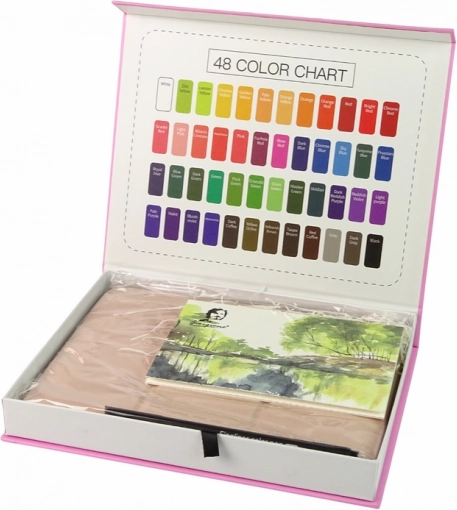 Kompletan akvarelni set za djecu i odrasle s 48 živih boja, praktičnim vodeno punjivim kistom, kistovima i spužvicom, dvama finelinerima (crni i bijeli) te razglednicama za slikanje. Pohranjeno u elegantnoj ružičastoj metalnoj kutiji u magnetskom omotu. Certifikati CE, norma EN71, prikladno od 3 godine.