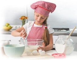 Djevojčica u kuhinji, koja kroz igru podučava djecu osnovama pečenja i kuhanja.