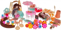 U kompletu je potpuno opremljeni namještaj, vrtna ljuljačka, suncobran, životinjice i skuter. Tri lutke imaju pokretne udove i dugu kosu idealnu za češljanje.