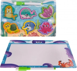 Ova obostrana drvena ploča spaja crtanje i slaganje puzzli u jednom kompaktnom setu. S jedne strane je glatka površina za crtanje priloženim brisivim flomasterom s gumicom, a s druge reljefna ploča s udubljenjima za postavljanje drvenih dijelova s morskim životinjama. Djeca vježbaju maštu, strpljenje i prepoznavanje oblika.