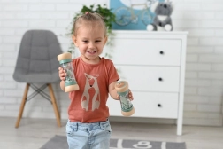 Drveni krajevi igračke sadrže lijepu ilustraciju pilića, što dodatno doprinosi njezinom estetskom dojmu. Ovu senzornu igračku najmlađi mogu koristiti za razvoj motoričkih vještina i koordinacije.