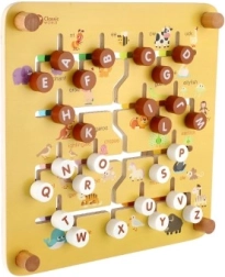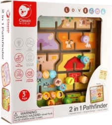 Obostrani drveni labirint 2 u 1 brenda CLASSIC WORLD spaja igru i učenje: s jedne strane farma sa životinjama, s druge strane abeceda sa životinjama. Djeca vježbaju finu motoriku, logičko razmišljanje i koncentraciju dok vode klizače kroz labirint do pravih mjesta. Kvalitetna drvena izrada, dimenzije 30 × 30 cm, prikladno od 3 godine.