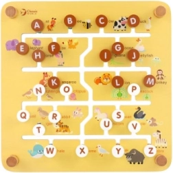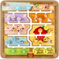 Pametan i zabavan alat za predškolce: obostrana ploča skriva dva svijeta. Na farmi djeca pomiču klizače sa životinjama, licima i voćem po urezanim stazama do njihovih mjesta. Okretanjem ploče pretvara se u abecedni labirint – zadatak je dovesti klizač s početnim slovom do odgovarajuće životinje (nazivi su na engleskom), pa se kroz igru vježbaju slova i vokabular.