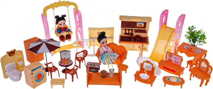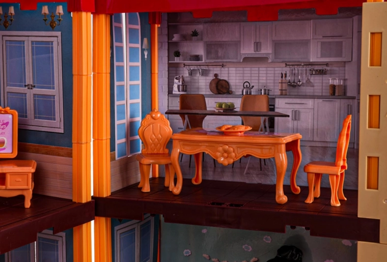 Kuhinja, kupaonica, spavaća soba, glazbeni kutak, namještaj, dodaci, 2 lutke, 2 psića i razni igraći elementi za beskrajnu zabavu.
