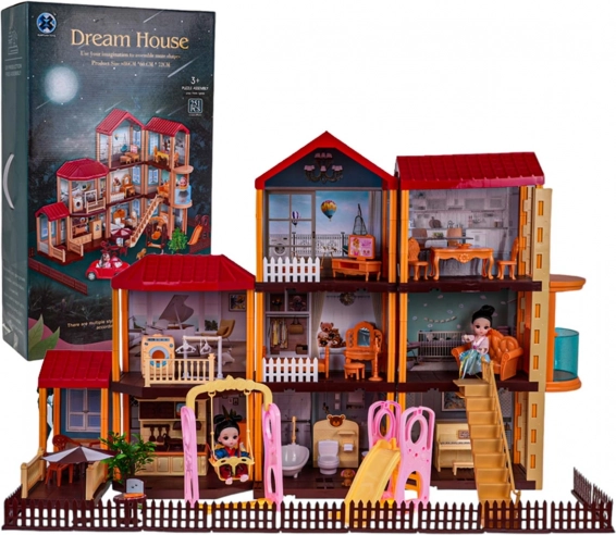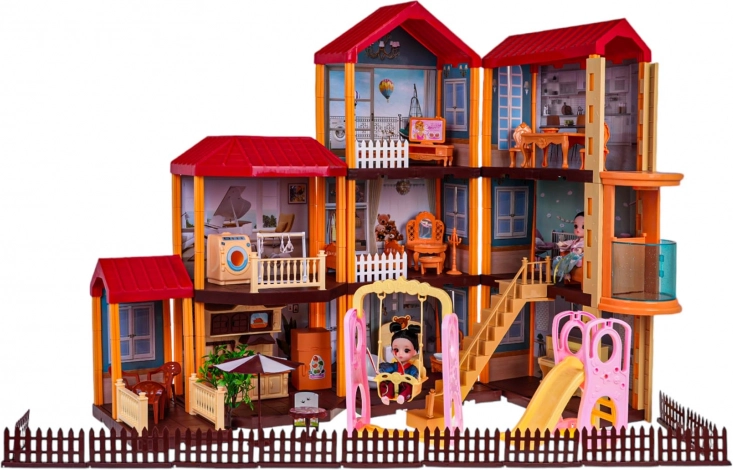 Ova prostrana plastična kućica u živim bojama pruža djeci bezbroj mogućnosti za kreativnu igru. Unutrašnjost uključuje kuhinju, kupaonicu, glazbenu sobu, dnevni boravak, spavaću sobu, garderobu i dnevnu sobu. Oko kućice je ograda i vanjska zona sa sjedećim dijelom, suncobranom i dječjim igralištem s toboganom i ljuljačkom.