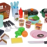 . | - velika kuhinja, .- ploča, .- kreda, .- spužva, .- lonac s poklopcem, .- tava s poklopcem, .- košarica, .- zdjela, .- 2 x šalica, .- čajnik, .- soljenka, .- 2 x posudica za začine, .- paparica, .- soja umak, .- ljuti umak, .- kiseli umak, - kečap, .- 2 x džem, .- 2 x sendvič, .- 2 x tanjur, .- 1 x pladanj, .- krastavac, 5 kriški paprike, banana, 2 kriške mrkve, mrkva, 2 lista salate, 2 x grašak, 2 kriške luka, 2 kriške brokule, kukuruz, krumpir, kruška, .- žlica, vilica, nož, .- kutlača, cjedilo, špatula, žlica za tjesteninu, satara, .- sredstvo za pranje, .- kartonska pakiranja mlijeka, soka, keksa, hamburgera, hamburgera, .- set naljepnica. . |