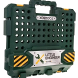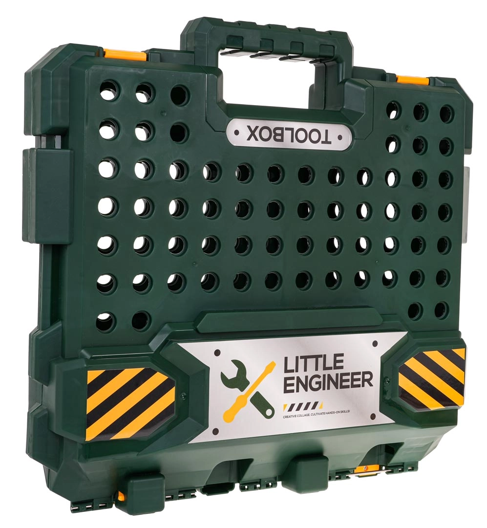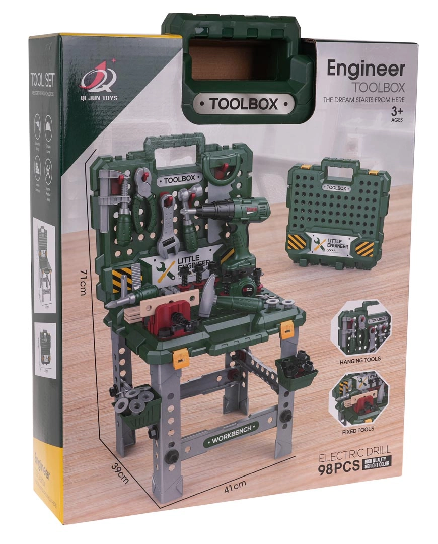 Uključuje baterijsku bušilicu-odvijač, koja zaista uvrtava i odvrtava vijke, zajedno s realističnim zvučnim efektima. Također sadrži niz drugih alata, poput pile, čekića, ili podesivog ključa, što pomaže djeci u razvoju fine motorike i kreativnosti.