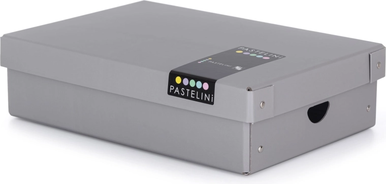 Praktična laminirana spremna kutija PASTELINI u elegantnoj sivoj boji sa stabilnim poklopcem i izrezima za rukohvate za jednostavno rukovanje. Zahvaljujući kompaktnim dimenzijama 355 × 240 × 95 mm i maloj težini 0,41 kg pouzdano čuva dokumente, igračke i druge sitnice kod kuće i u uredu.