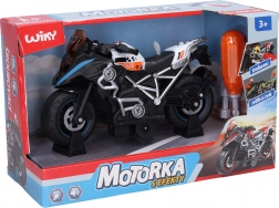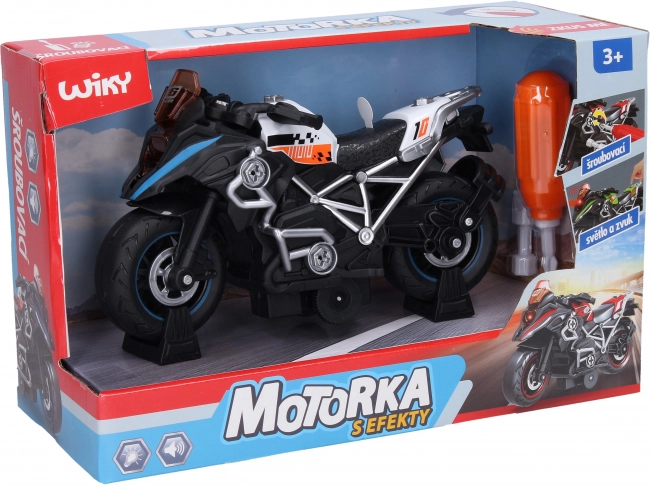 Ovaj bijeli vijčani motocikl duljine 20 cm izvrsna je igračka za razvoj fine motorike i tehničkog razmišljanja. Djeca ga mogu sama rastaviti i ponovno sastaviti pomoću priloženog odvijača i ključa. Pritiskom na stražnji dio motocikla pokreću se svjetlosni i zvučni efekti koji dodatno oživljavaju igru.
