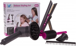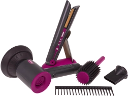 Idealni frizerski set za djecu koja žele postati mali frizeri. Bogato opremljen set sadrži sušilo za kosu s izmjenjivim nastavcima, peglu za kosu, češalj i četku. Sušilo za kosu se napaja s dvije AA baterije (nisu uključene u pakiranju) i proizvodi zvukove kao kod pravog sušenja kose. Pegla svijetli i proizvodi tipične zvukove nakon uključivanja.