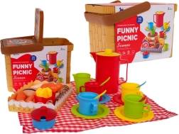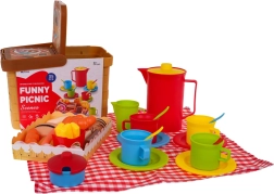 Sadržaj seta: košara s ručkom, piknik deka, kartonski poslužavnik, veliki i mali čajnik s izljevom, 4 tanjurića, 4 čaše, 4 žličice, lonac s poklopcem, košarica s poslasticama (kroasan, 7 keksa, čokolada, vafle, hot-dog, pomfrit i kečap).