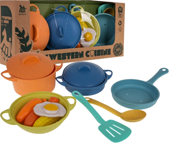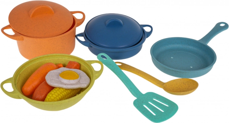 U setu se nalaze tavica, 2 lonca s poklopcima, cjedilo, lopatica, žlica i namirnice za igru. Sve u živim bojama koje će djecu privući na prvi pogled.