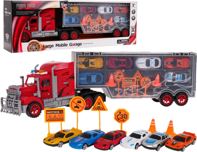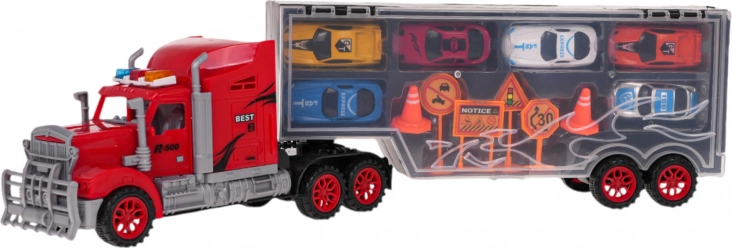 Otkrijte zabavu na putu s velikim kamionom koji u prozirnoj prikolici prevozi 6 šarenih autića i set prometnih znakova. Stražnja vrata prikolice se otvaraju i stvaraju rampu za glatko izlazak vozila. Nakon odvajanja, prikolica se pretvara u torbicu s udobnom ručkom, pa djeca mogu svoj vozni park ponijeti kamo god požele.