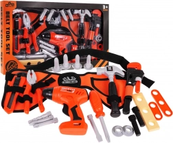 Bogat dječji set alata s podesivim pojasom razveselit će male majstore od 3 godine. Sadrži sve potrebno za igru majstora – piljenje, bušenje, odvrtanje i zakucavanje. U kompletu je ručna inercijska bušilica s izmjenjivim bitovima koja radi bez baterija – dovoljno je pritisnuti gumb. Za sigurnu i zabavnu igru u živim bojama, razvija finu motoriku, maštu i vještine uloga.