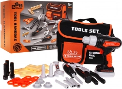Kliješta, čekić, ključ, odvijači, vijci, tiple, nastavci i "drvene" pločice za vježbanje zavrtanja i sastavljanja.