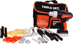 Detaljno osmišljena torba nudi glavni pretinac na čičak, prednji džepić i držače za alate. Električna bušilica na 2× AA baterije (uključene) može zatezati i otpuštati, ima izmjenjive bitove i izvlačivi akumulator, pa djeca uživaju u autentičnom doživljaju popravka i montaže.