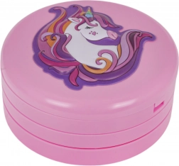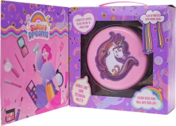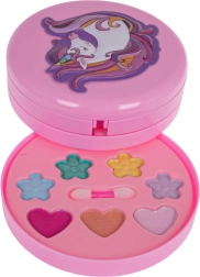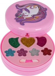 Sklopiva ružičasta škrinjica s motivom jednoroga krije šareni svijet mašte: cvjetiće, srca i zvjezdice pune sjenila, balzama i šljokica. Zahvaljujući ugrađenom ogledalu i priloženim aplikatorima djeca mogu sigurno i udobno otkrivati svijet šminkanja.