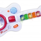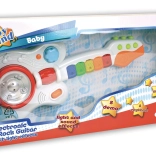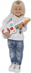 Svjetlosni efekti dodaju zabavu i energiju pri svakoj svirci. Napajanje osiguravaju 3 R6 / AA 1,5V baterije, koje nisu uključene u pakiranje. Gitara je prikladna za djecu od 1,5 godine i dimenzija je 17 x 40 x 5 cm.