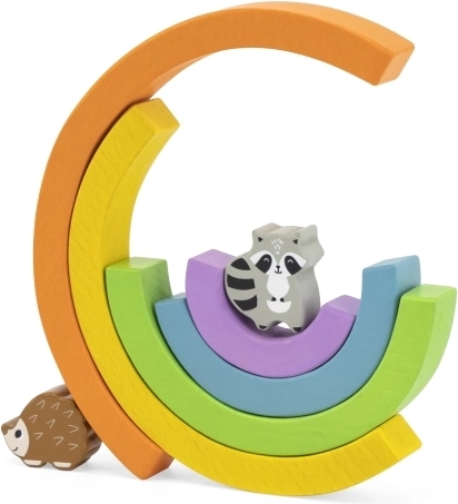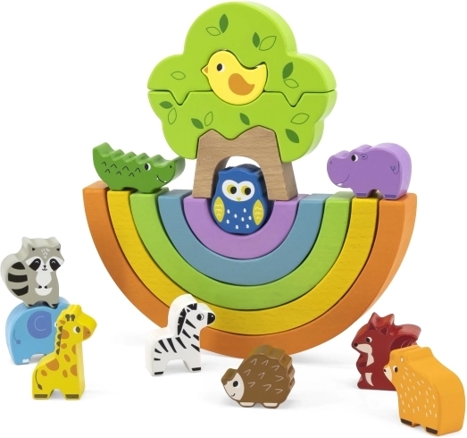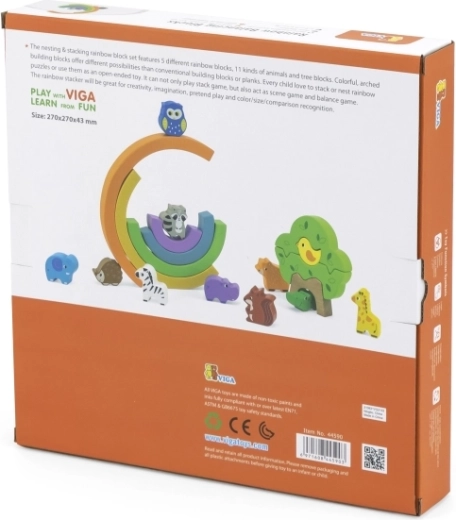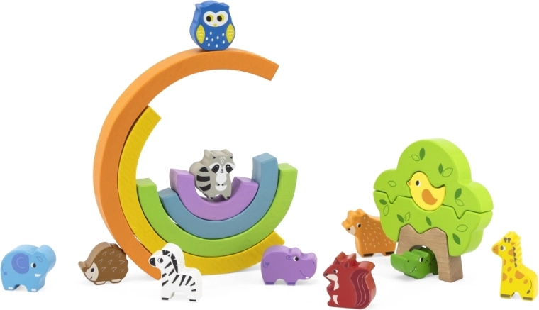 Šarena drvena duga s 11 životinjica i stabalom od Vige nudi beskrajne mogućnosti kreativne igre. Djeca vježbaju ravnotežu i koordinaciju, grade kućice i prepreke te uče boje i redoslijed. Glatki dijelovi od kvalitetnog drva sigurni su, bez oštrih rubova i lakirani netoksičnim bojama.